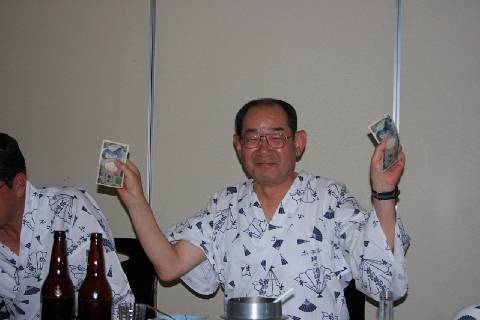 | えーと、僕はこれ(賞金)で家計を助けます(古田君) | えーと、僕はこれ(スコア表の誤り)を訂正中です(幹事役の斉田君) |